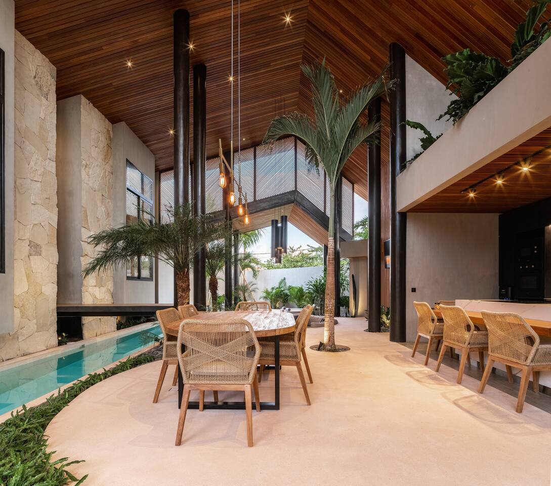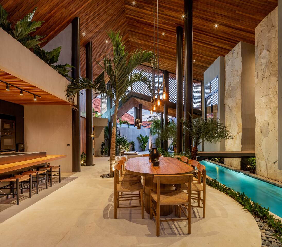 Welcome to House of Winds, a 9BR retreat made of three independent 3BR villas – designed by Biombo Architects. Each villa features a 25m lap pool flowing through its open-plan living area. Enjoy the perfect blend of privacy and connection with spacious shared areas, ideal for families or groups. Located in peaceful Umalas, just minutes from Canggu and Seminyak. Just opened to the public in August 2023 An exquisite masterpiece offering a perfect blend of luxury, elegance, and tropical ambiance.