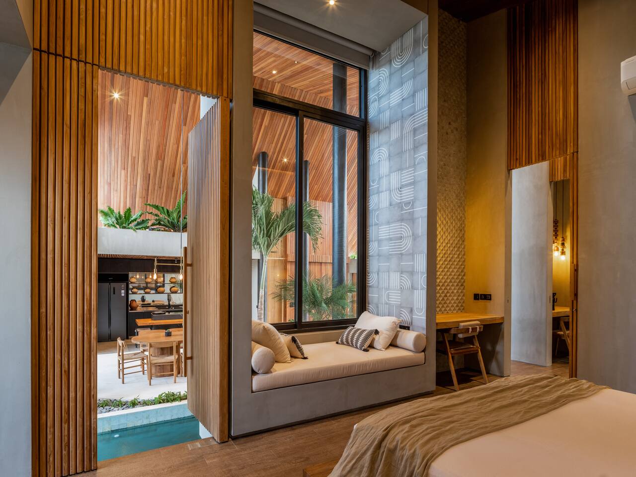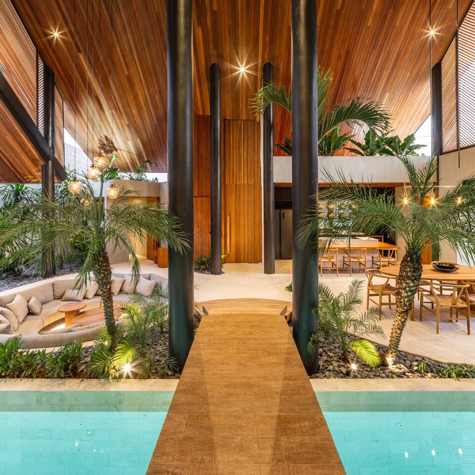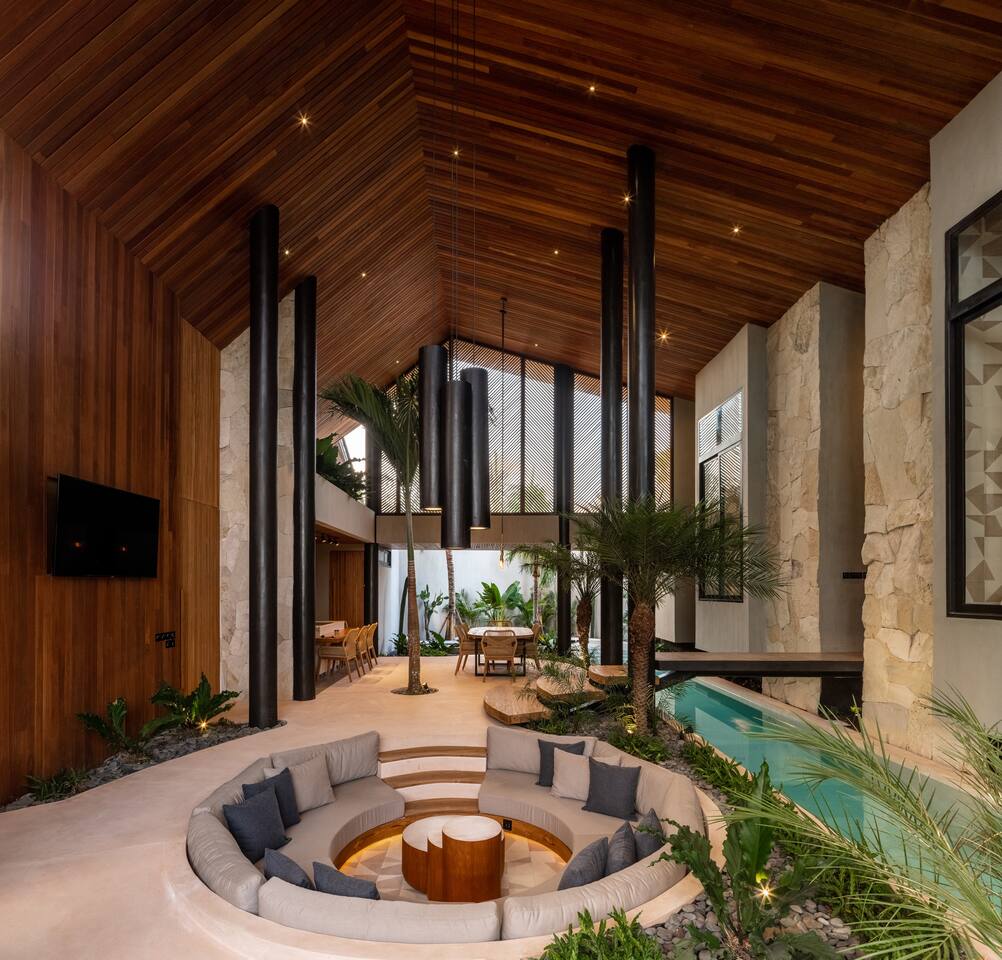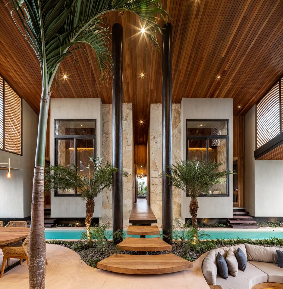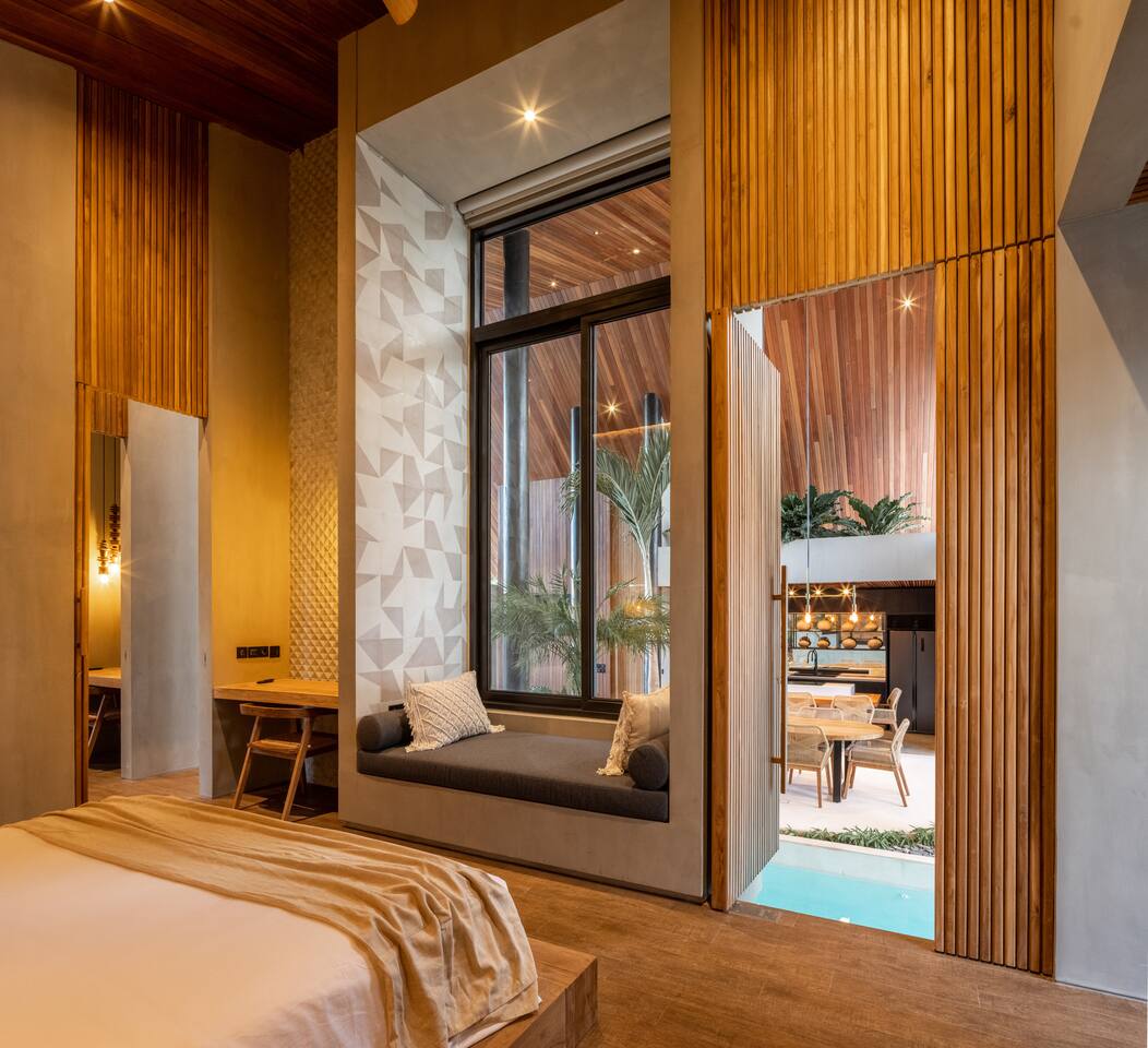 This listing includes three separate 3-bedroom villas. Each villa is identical in design and offers: 400 square meters of private land, structured around a tranquil 25-meter pool, with a wooden bridge connecting two distinct wings: Living Wing – Sunken lounge with modular seating and Bluetooth audio – Elegant dining space with natural light – Fully equipped kitchen with premium appliances Sleeping Wing – Master suite with king bed, circular soaking tub and private indoor-outdoor bath – Two guest rooms with king beds, open-air en-suites and direct pool access The architecture blends organic materials—wood, stone and water—to create a gentle, open flow ideal for rest and focus. Together, the villas offer shared privacy and space, ideal for large families, friend groups, retreats or celebrations.