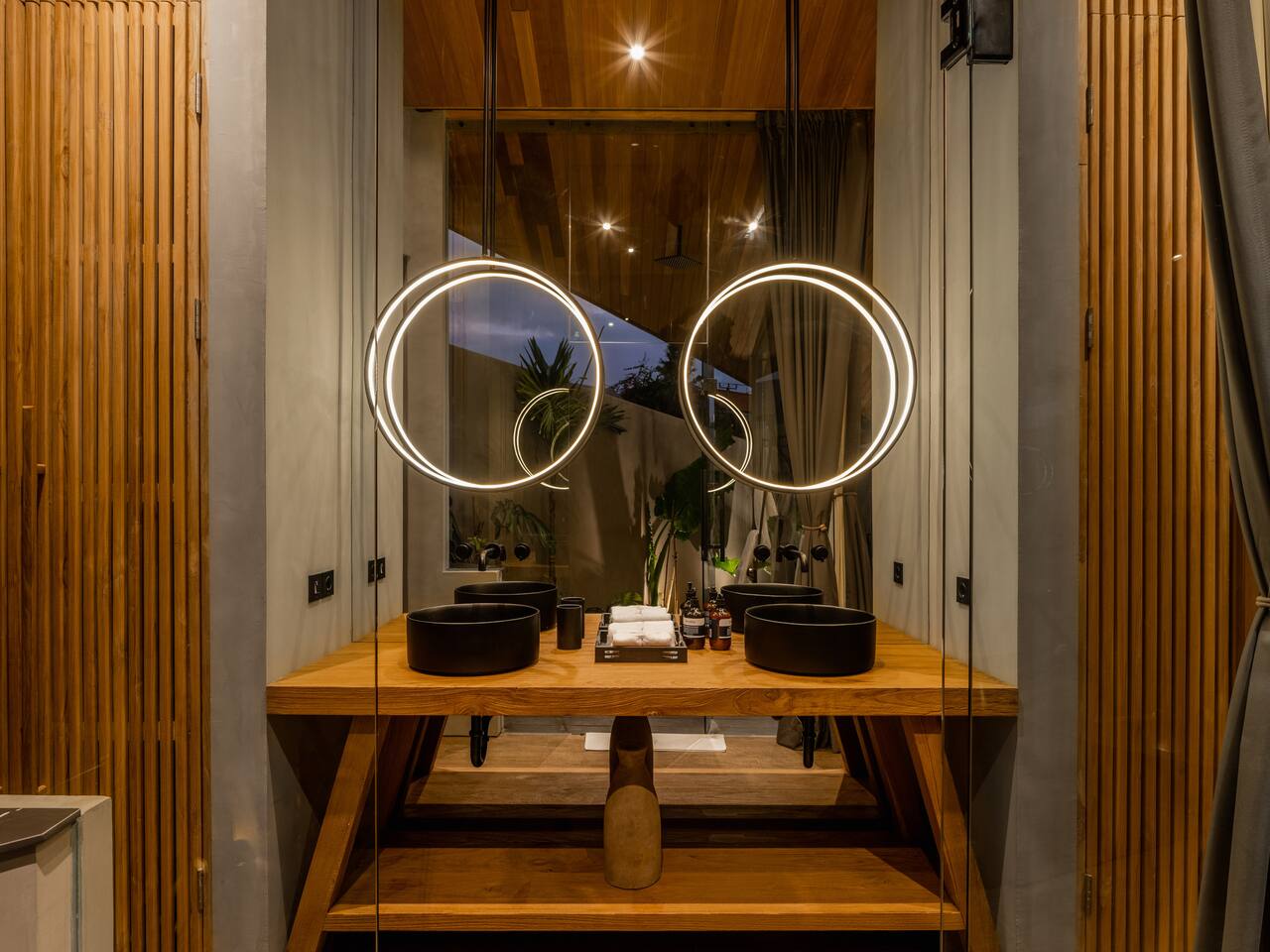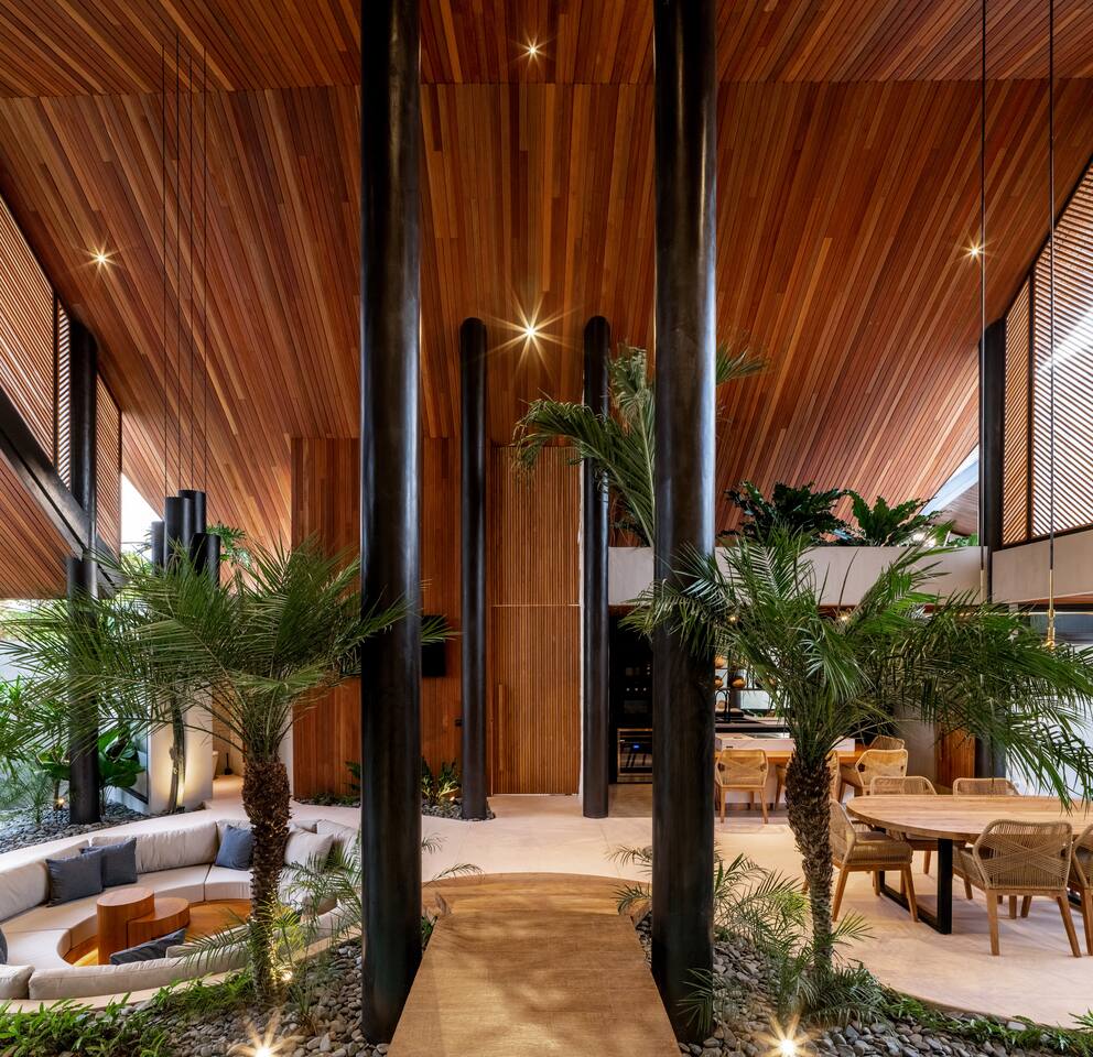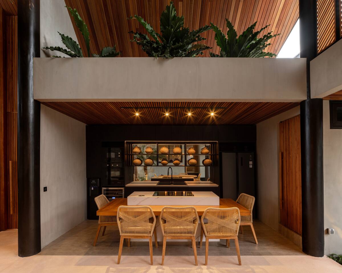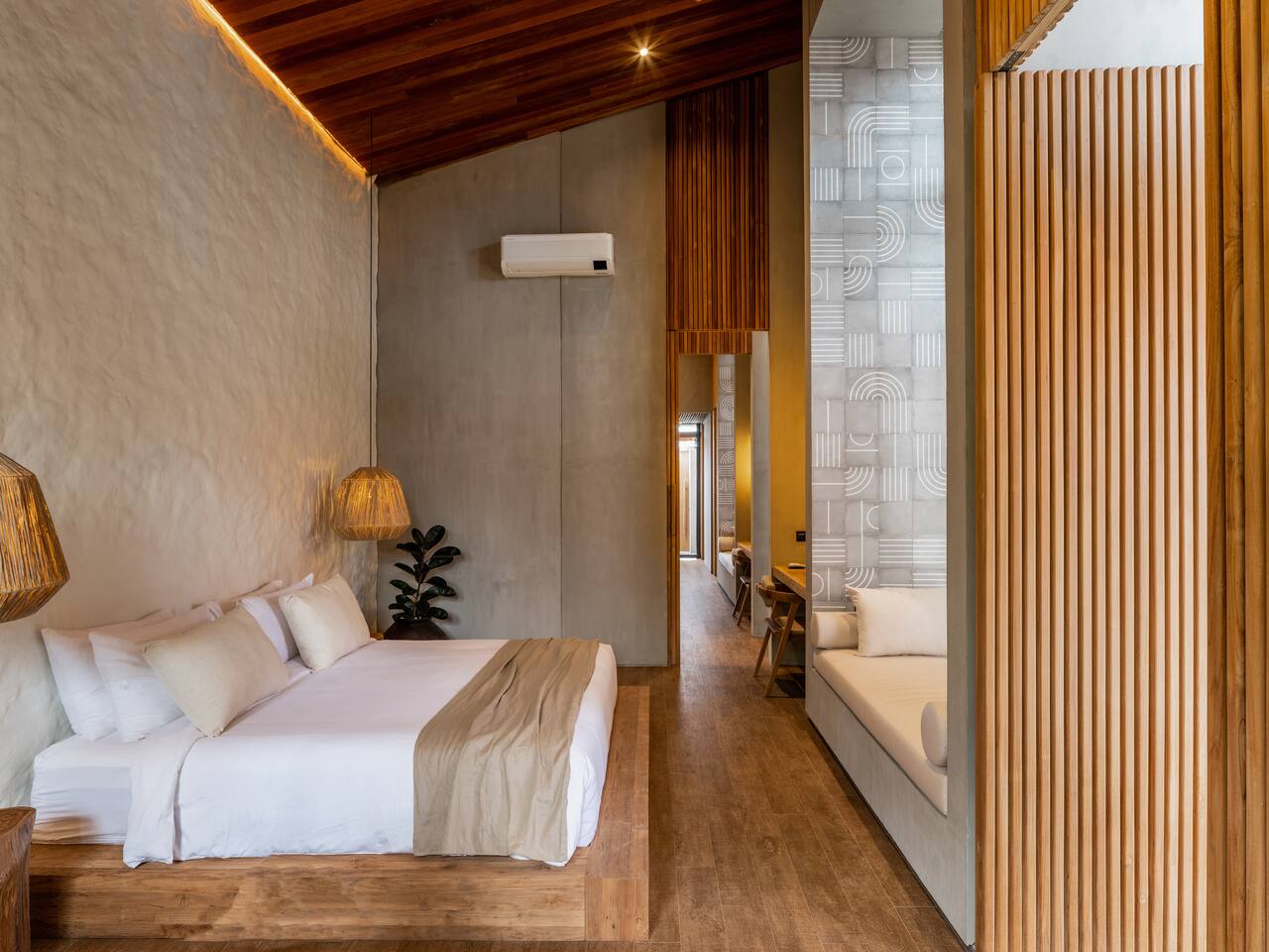 This listing includes three separate 3-bedroom villas. Each villa is identical in design and offers: 400 square meters of private land, structured around a tranquil 25-meter pool, with a wooden bridge connecting two distinct wings: Living Wing – Sunken lounge with modular seating and Bluetooth audio – Elegant dining space with natural light – Fully equipped kitchen with premium appliances Sleeping Wing – Master suite with king bed, circular soaking tub and private indoor-outdoor bath – Two guest rooms with king beds, open-air en-suites and direct pool access The architecture blends organic materials—wood, stone and water—to create a gentle, open flow ideal for rest and focus. Together, the villas offer shared privacy and space, ideal for large families, friend groups, retreats or celebrations.
