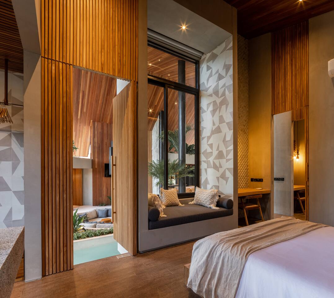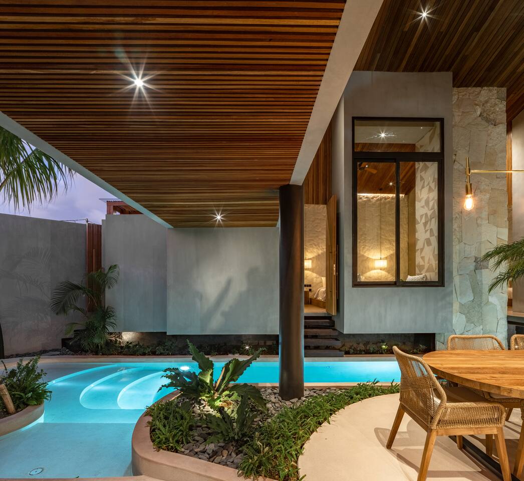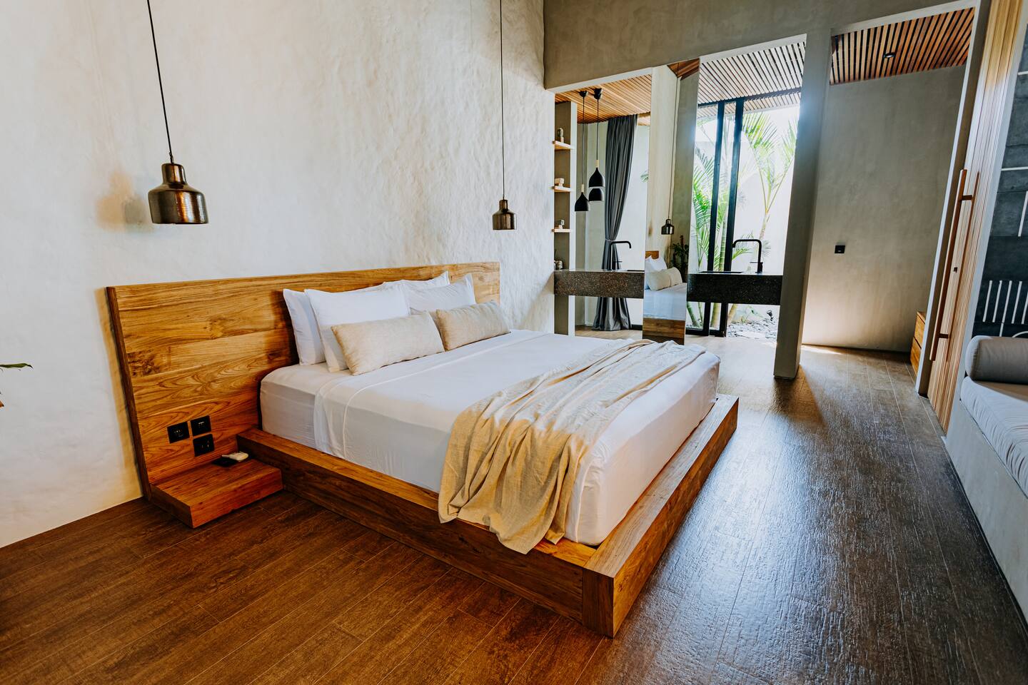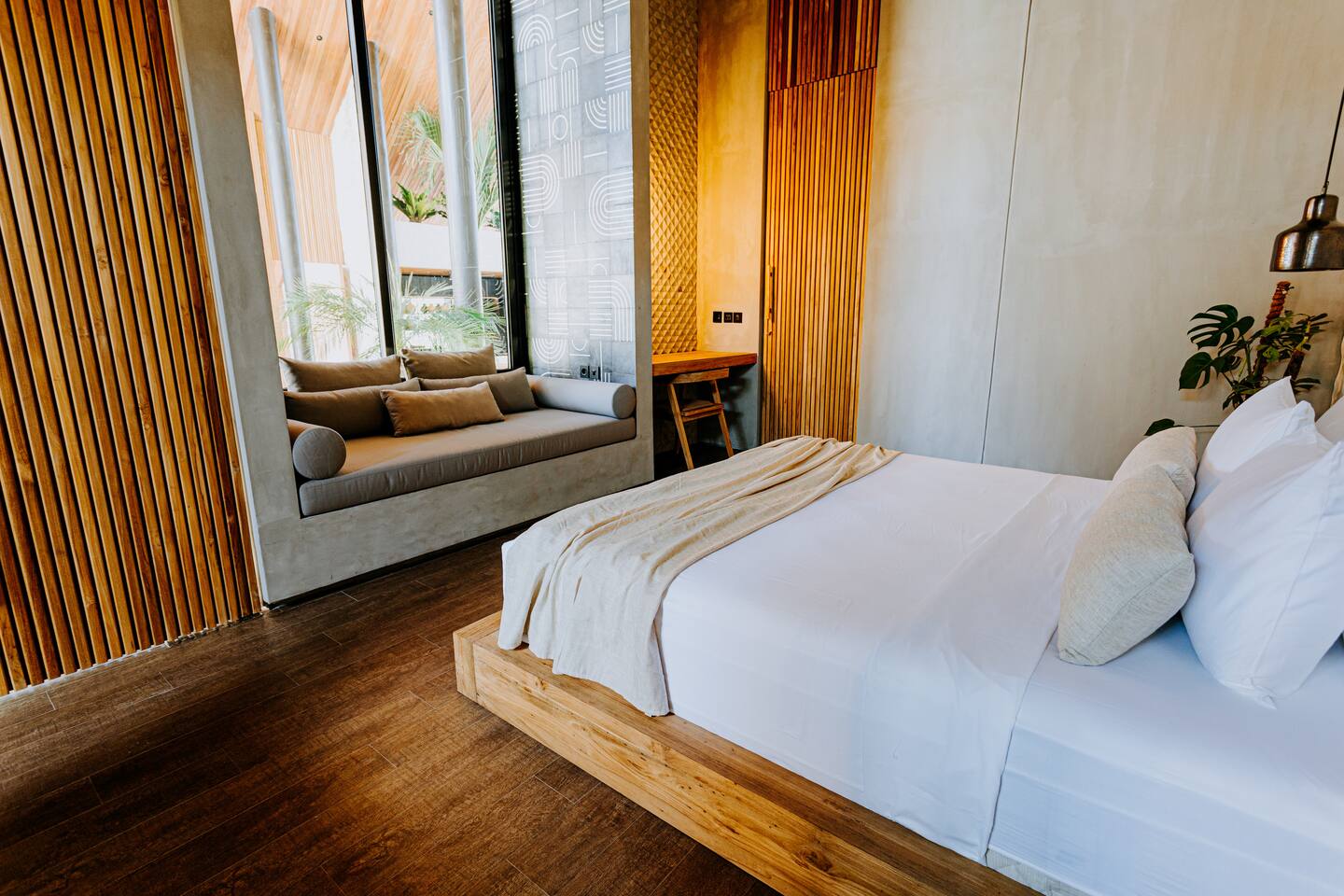 Spanning 400 square meters of private land, Villa Feh is structured around a tranquil 25-meter pool, with a wooden bridge connecting two distinct wings: Living Wing – Sunken lounge with modular seating and Bluetooth audio – Elegant dining space with natural light – Fully equipped kitchen with premium appliances Sleeping Wing – Master suite with king bed, circular soaking tub and private indoor-outdoor bath – Two guest rooms with king beds, open-air en-suites and direct pool access The architecture blends organic materials—wood, stone and water—to create a gentle, open flow ideal for rest and focus.