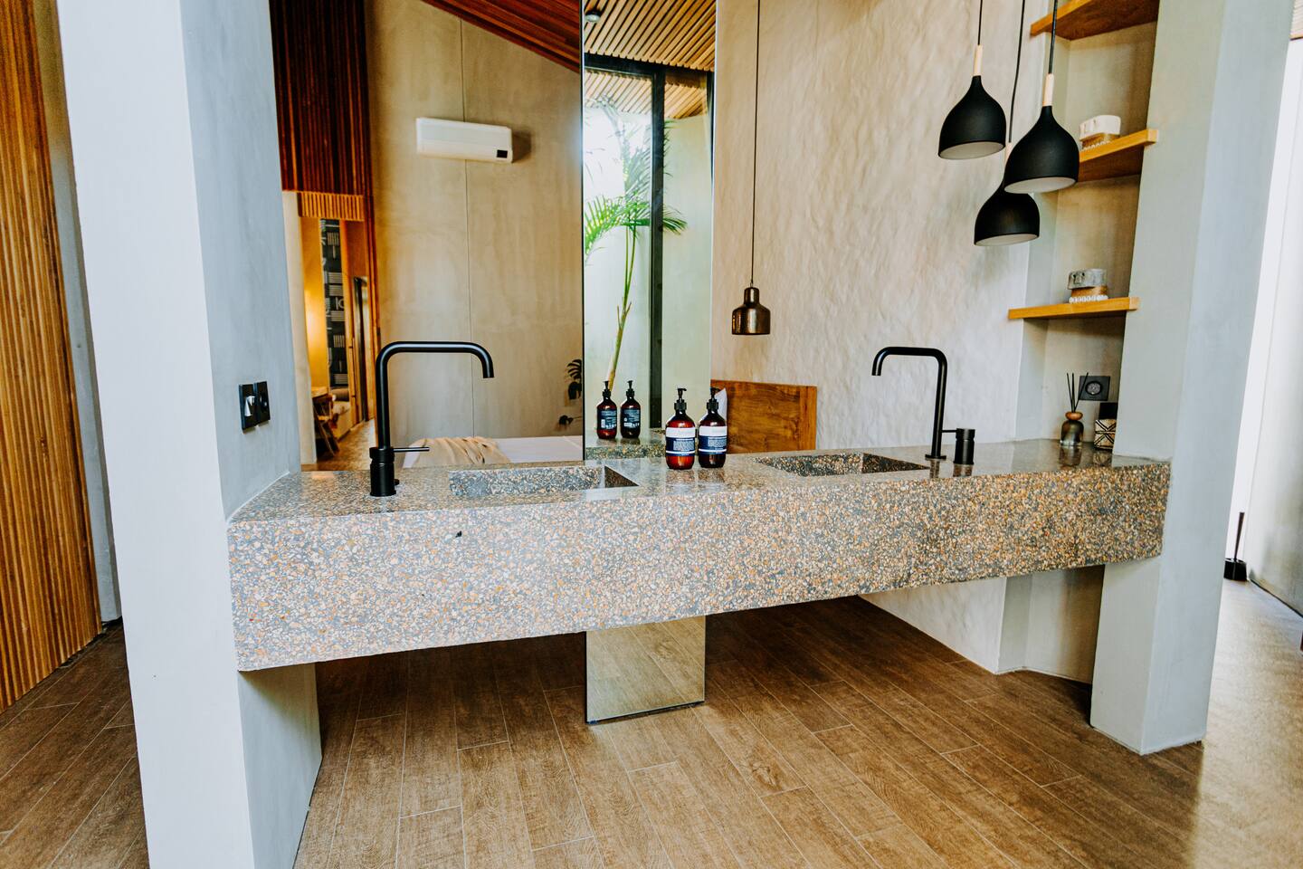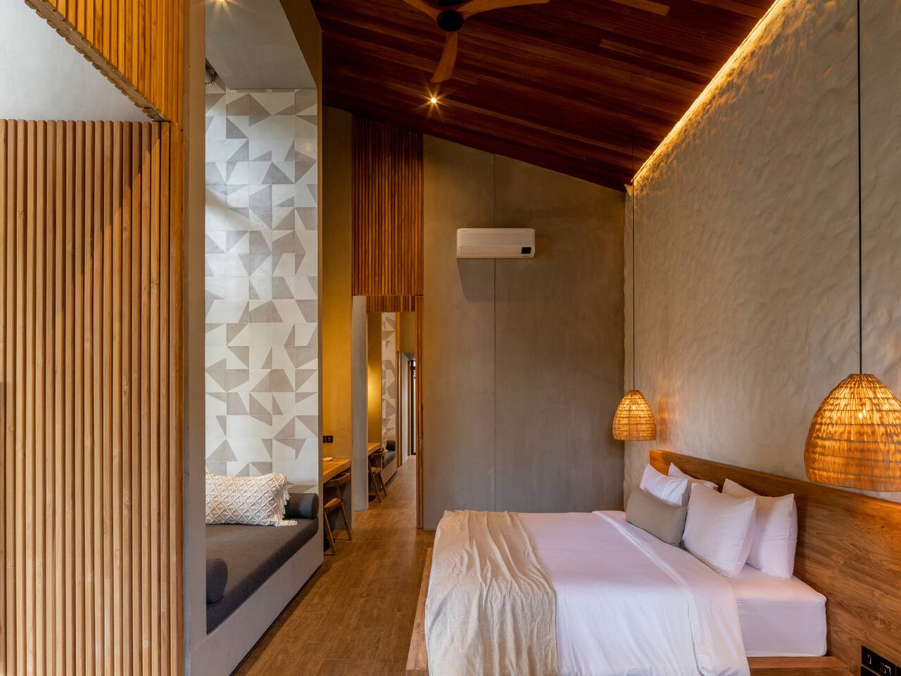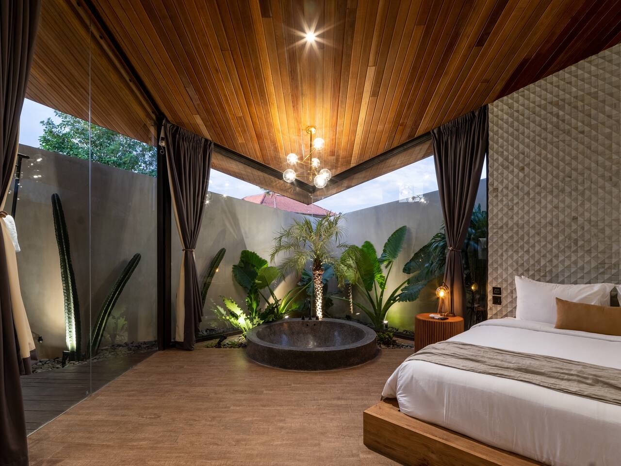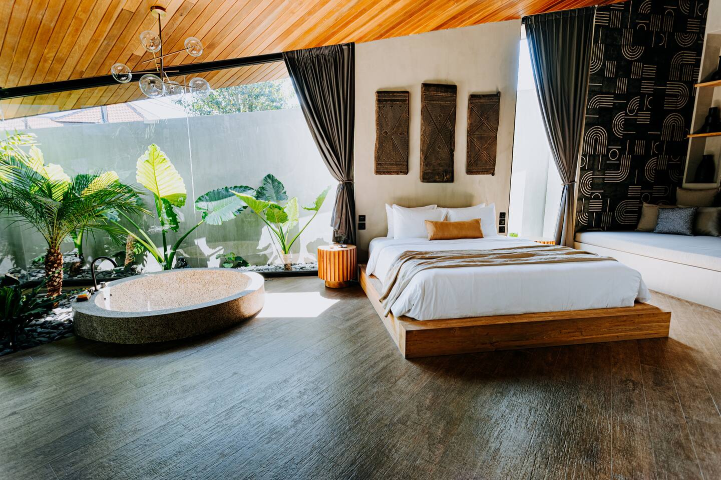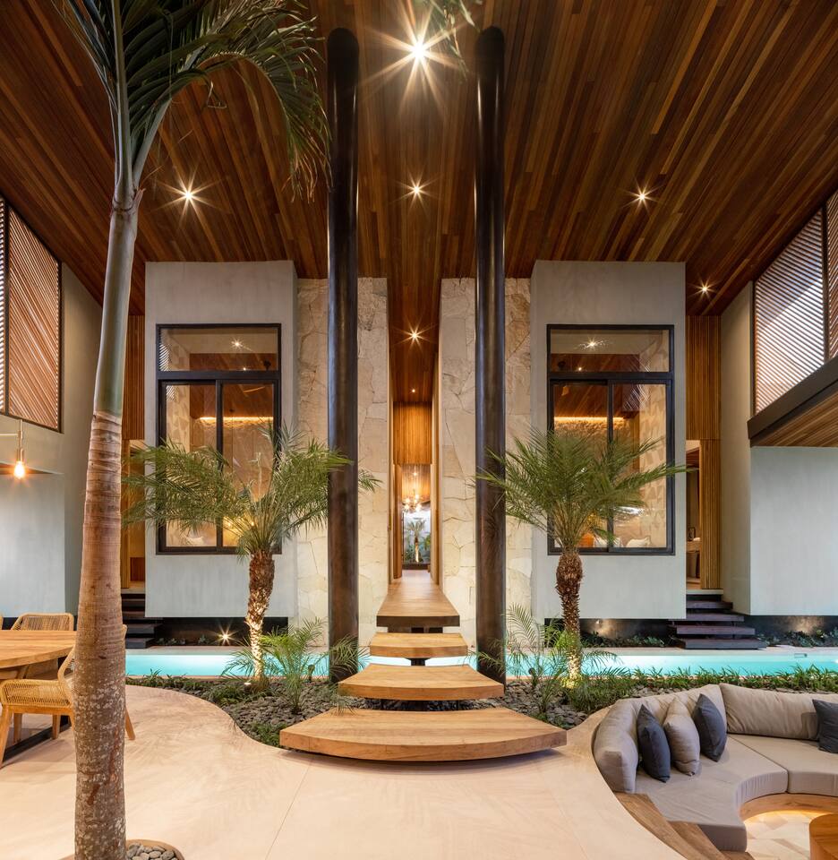 Spanning 400 square meters of private land, Villa Feh is structured around a tranquil 25-meter pool, with a wooden bridge connecting two distinct wings: Living Wing – Sunken lounge with modular seating and Bluetooth audio – Elegant dining space with natural light – Fully equipped kitchen with premium appliances Sleeping Wing – Master suite with king bed, circular soaking tub and private indoor-outdoor bath – Two guest rooms with king beds, open-air en-suites and direct pool access The architecture blends organic materials—wood, stone and water—to create a gentle, open flow ideal for rest and focus.