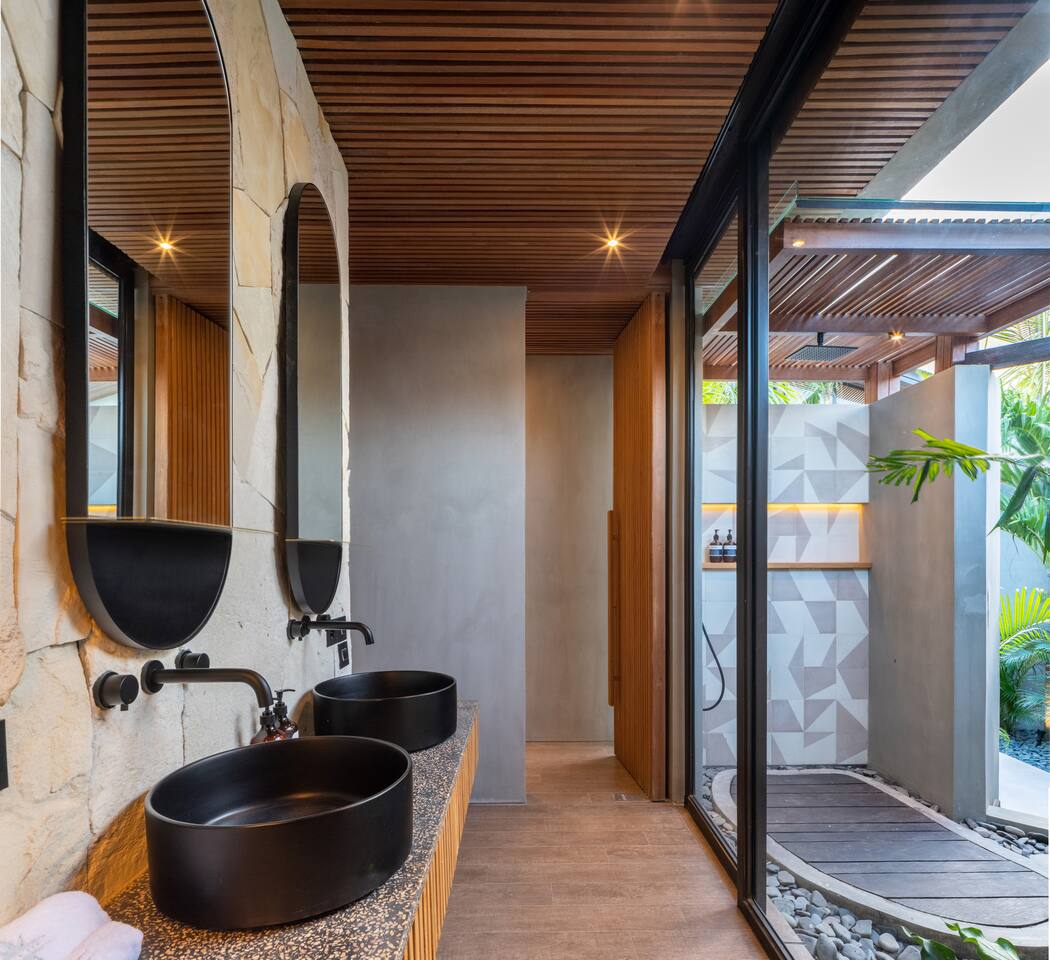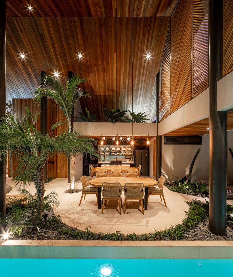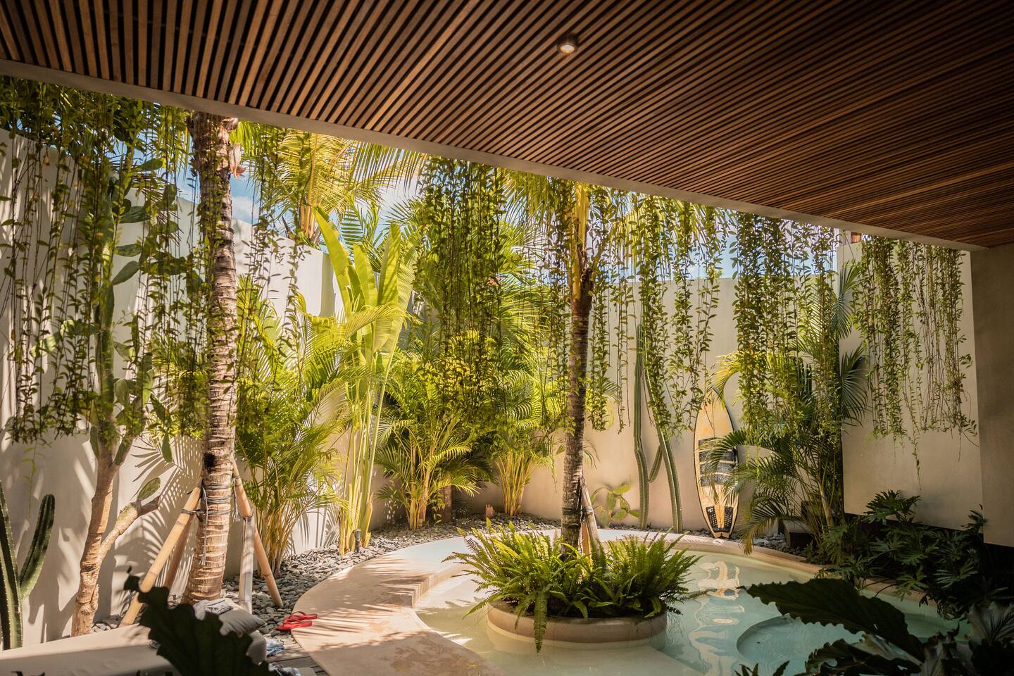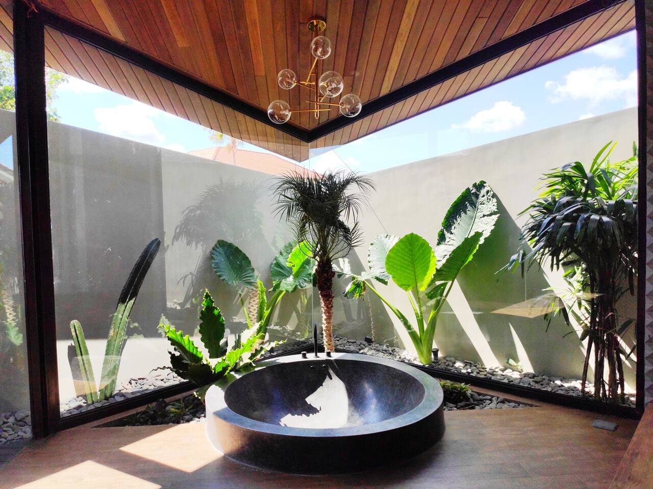 Spanning 400 square meters of private land, Villa Feh is structured around a tranquil 25-meter pool, with a wooden bridge connecting two distinct wings: Living Wing – Sunken lounge with modular seating and Bluetooth audio – Elegant dining space with natural light – Fully equipped kitchen with premium appliances Sleeping Wing – Master suite with king bed, circular soaking tub and private indoor-outdoor bath – Two guest rooms with king beds, open-air en-suites and direct pool access The architecture blends organic materials—wood, stone and water—to create a gentle, open flow ideal for rest and focus.