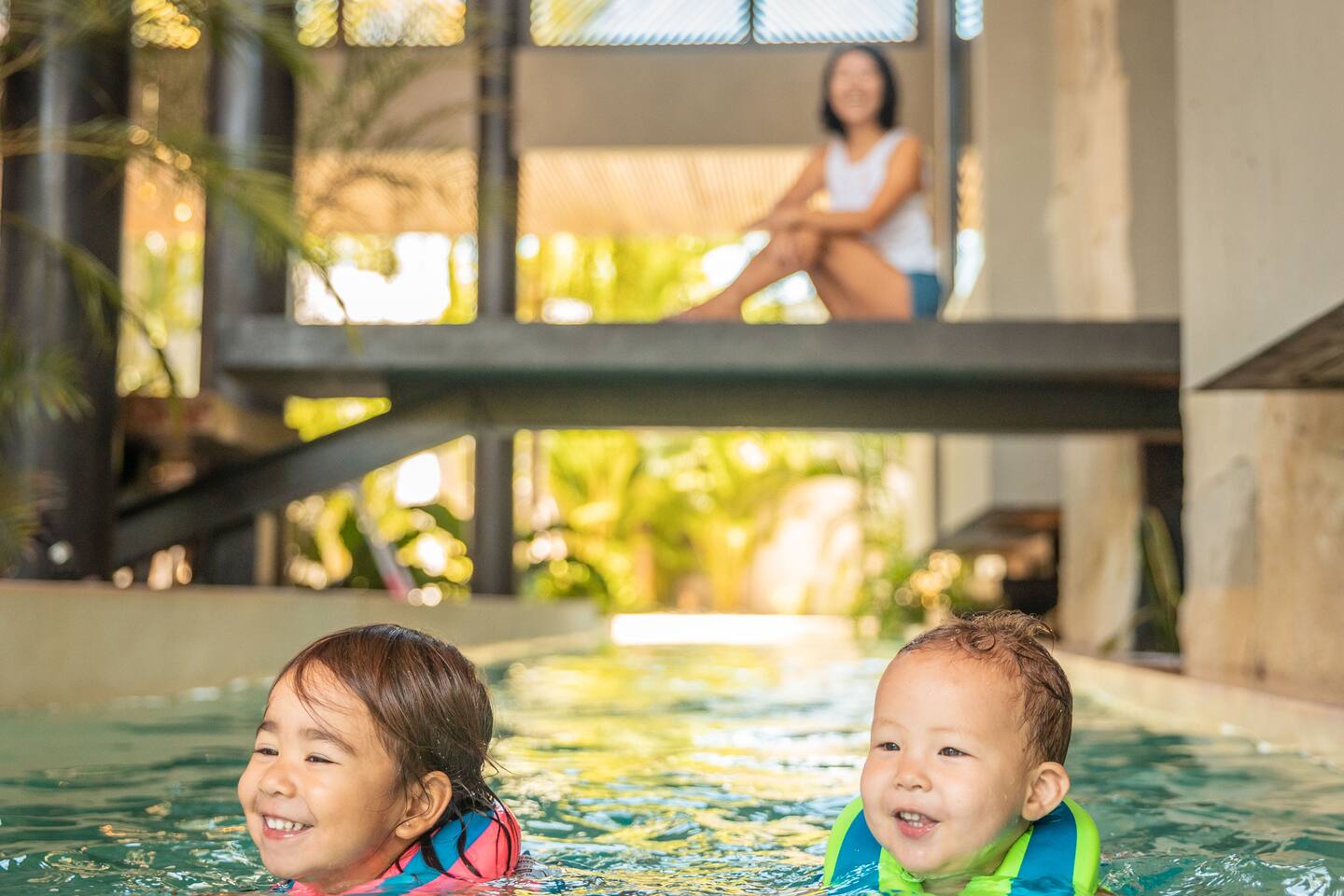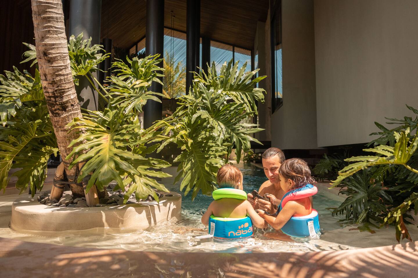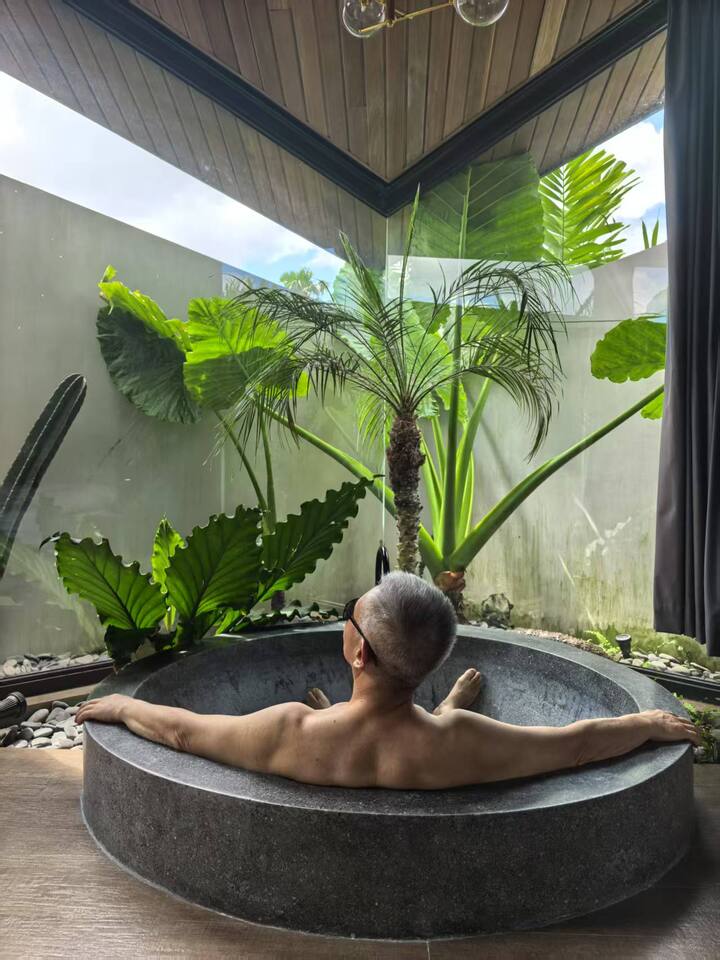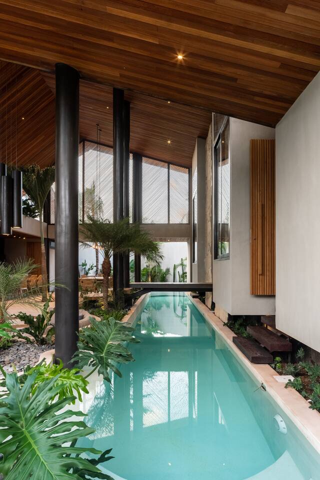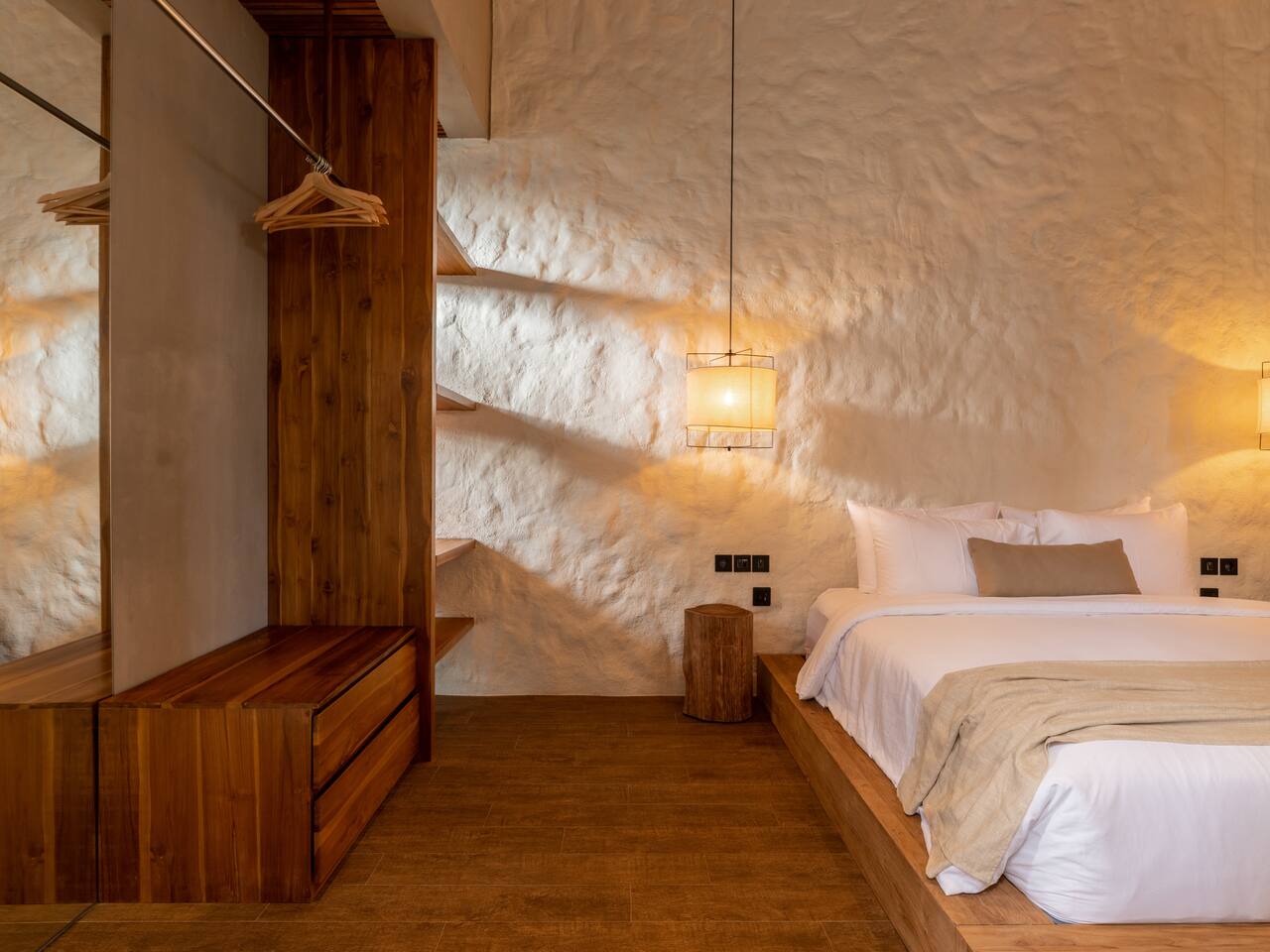 Spanning 400 square meters of private land, Villa Feh is structured around a tranquil 25-meter pool, with a wooden bridge connecting two distinct wings: Living Wing – Sunken lounge with modular seating and Bluetooth audio – Elegant dining space with natural light – Fully equipped kitchen with premium appliances Sleeping Wing – Master suite with king bed, circular soaking tub and private indoor-outdoor bath – Two guest rooms with king beds, open-air en-suites and direct pool access The architecture blends organic materials—wood, stone and water—to create a gentle, open flow ideal for rest and focus.