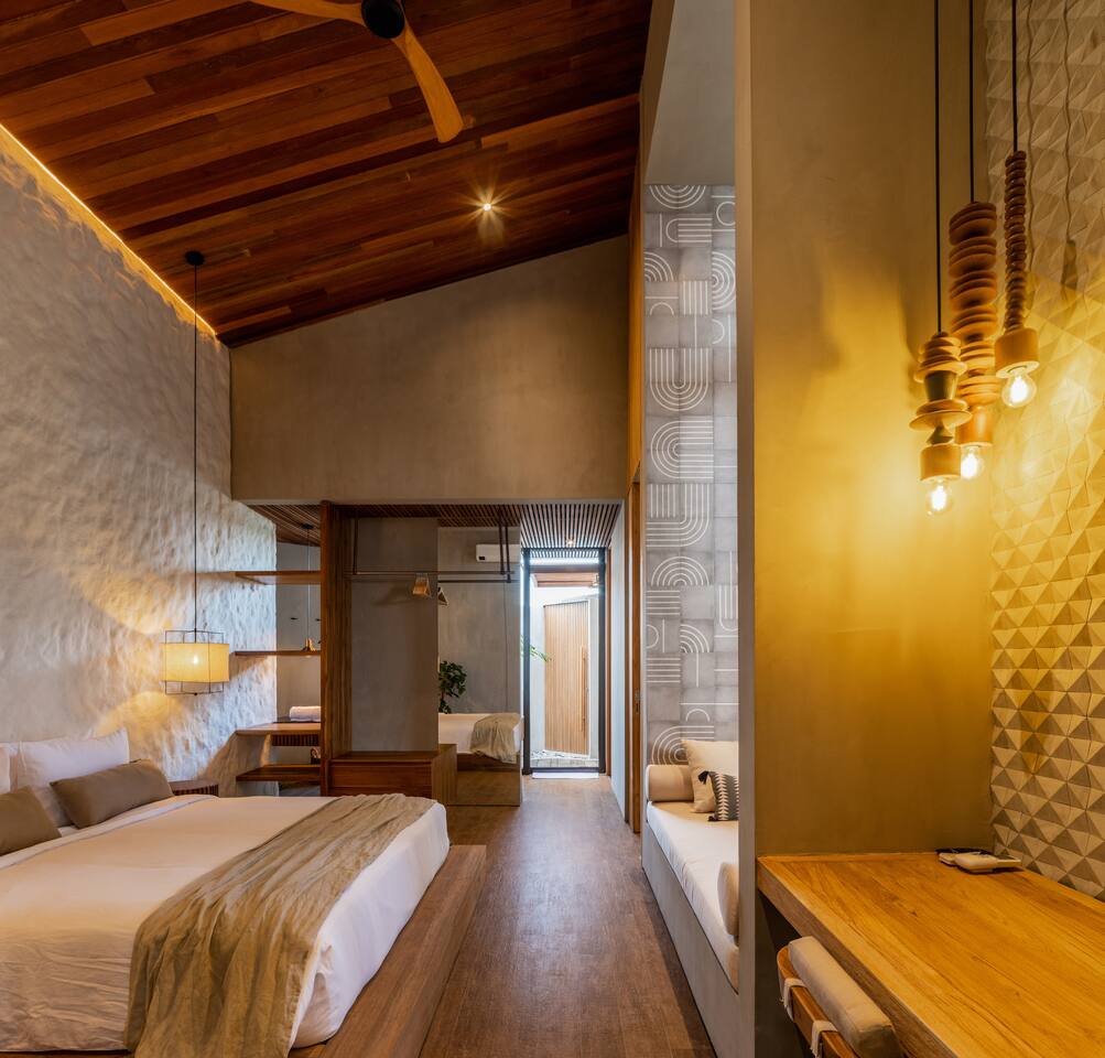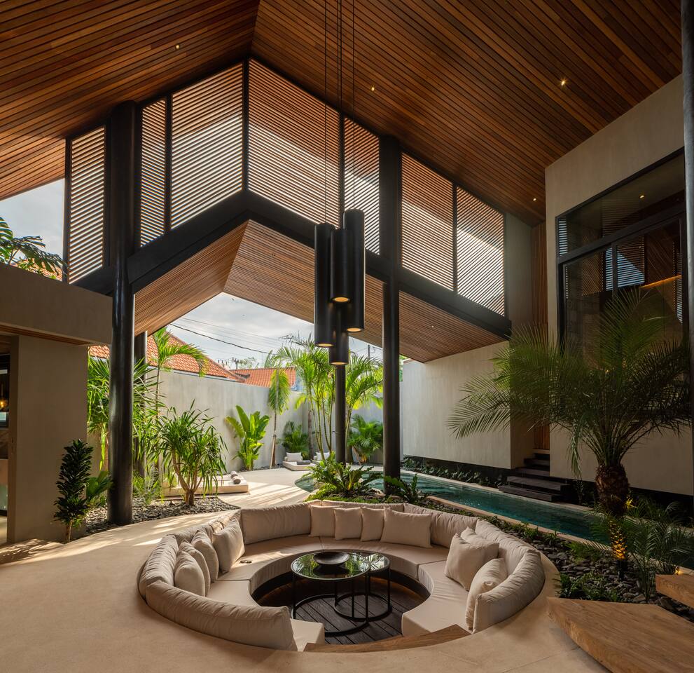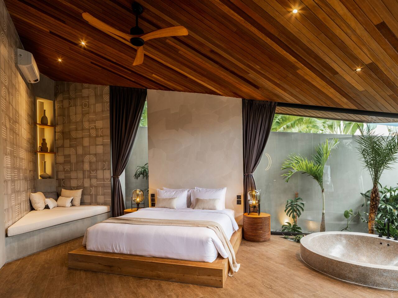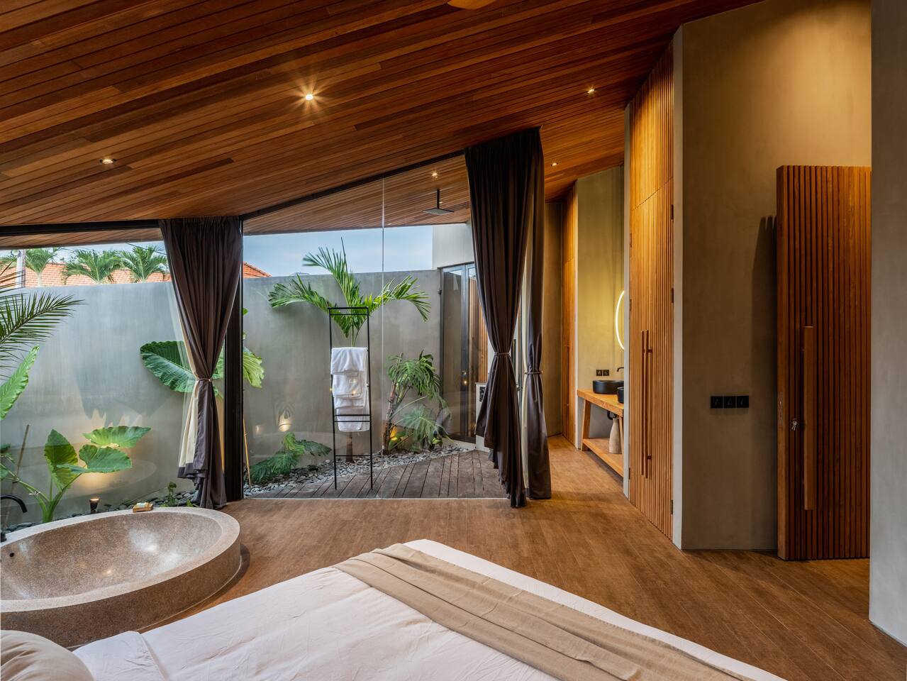 Spread across 400 square meters, Villa Levante is structured around its sunlit 25-meter swimming pool, which links two distinct wings: Living Wing – Sunken lounge with custom seating & Bluetooth audio – Dining space filled with daylight – Modern kitchen with premium appliances Sleeping Wing – Master bedroom with king bed, ensuite indoor-outdoor bath and circular soaking tub – Two guest bedrooms with king beds, direct pool access and open-air en-suites Natural textures, high ceilings and sliding glass panels keep the interiors breezy and bright. The villa is ideal for couples, small groups, or anyone seeking inspiration in simplicity.